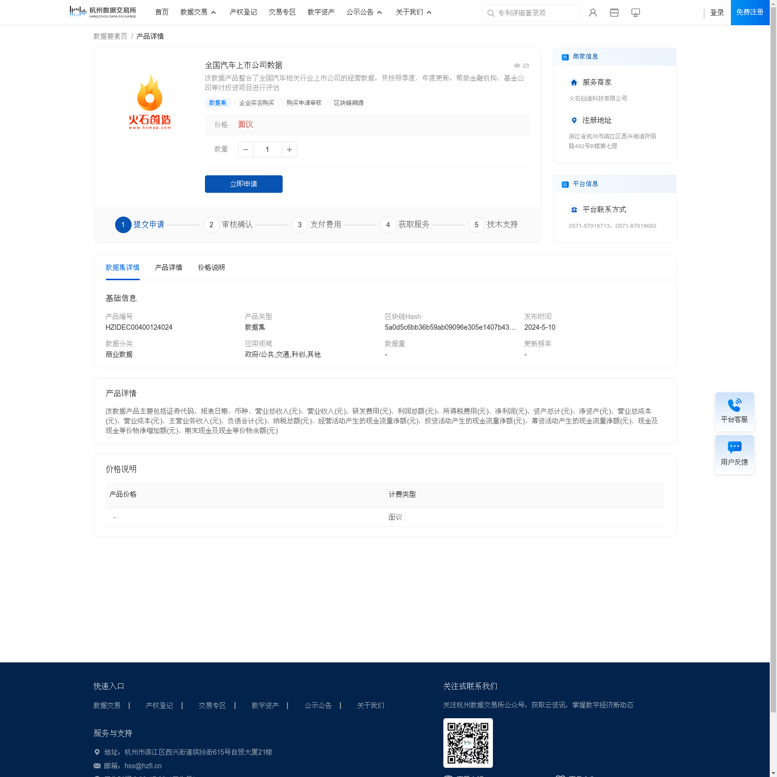 杭州费尔斯通科技有限公司 本次上架的数据产品 全国汽车上市公司数据, 该数据产品整合了全国汽车相关行业上市公司的经营数据,并按照季度、年度更新,帮助金融机构、基金公司等对投资项目进行评估