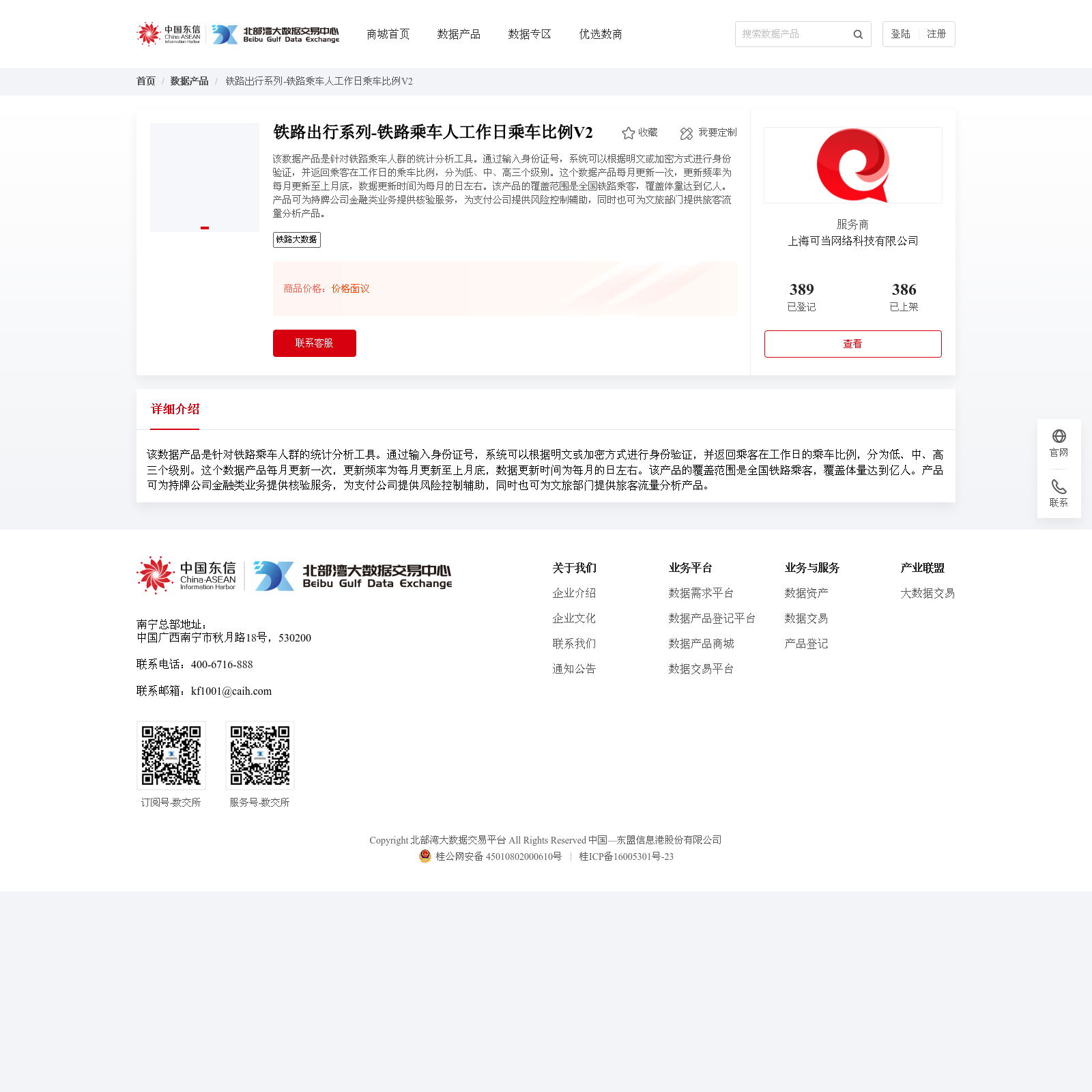 上海可当网络科技有限公司 本次上架的数据产品 铁路出行系列-铁路乘车人工作日乘车比例V2, 该数据产品是针对铁路乘车人群的统计分析工具。通过输入身份证号,系统可以根据明文或加密方式进行身份验证,并返回乘客在工作日的乘车比例,分为低、中、高三个级别。这个数据产品每月更新一次,更新频率为每月更新至上月底,数据更新时间为每月的日左右。该产品的覆盖范围是全国铁路乘客,覆盖体量达到亿人。产品可为持牌公司金融类业务提供核验服务,为支付公司提供风险控制辅助,同时也可为文旅部门提供旅客流量分析产品。