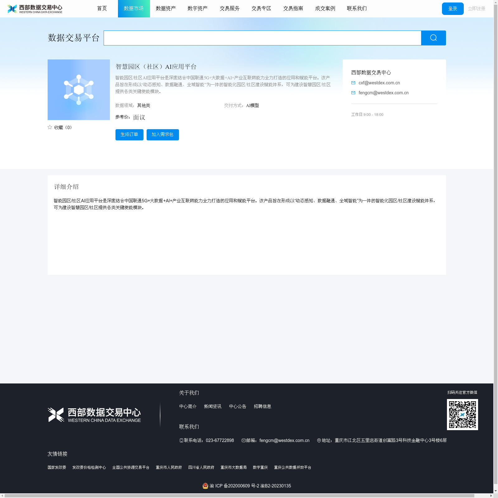 中国联合网络通信有限公司重庆市分公司 本次上架的数据产品 智慧园区(社区)AI应用平台, 智能园区/社区AI应用平台是深度结合中国联通5G+大数据+AI+产业互联网能力全力打造的应用和赋能平台。该产品旨在形成以“动态感知、数据融通、全域智能”为一体的智能化园区/社区建设赋能体系,可为建设智慧园区/社区提供各类关键使能模块。