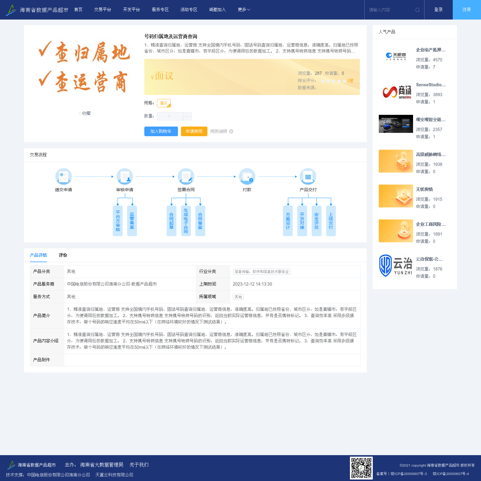 中国电信股份有限公司海南分公司-数据产品超市 本次上架的数据产品 号码归属地及运营商查询, 1、精准查询归属地、运营商 支持全国境内手机号码、固话号码查询归属地、运营商信息,准确度高。归属地已按照省份、城市区分,如是直辖市,有字段区分,方便调用后的数据加工。 2、支持携号转网信息 支持携号转网号码的识别,返回当前实际运营商信息,并有是否携转标记。 3、查询效率高 采用多级缓存技术,单个号码的响应速度平均在50ms以下(在网络环境较好的情况下测试结果)。