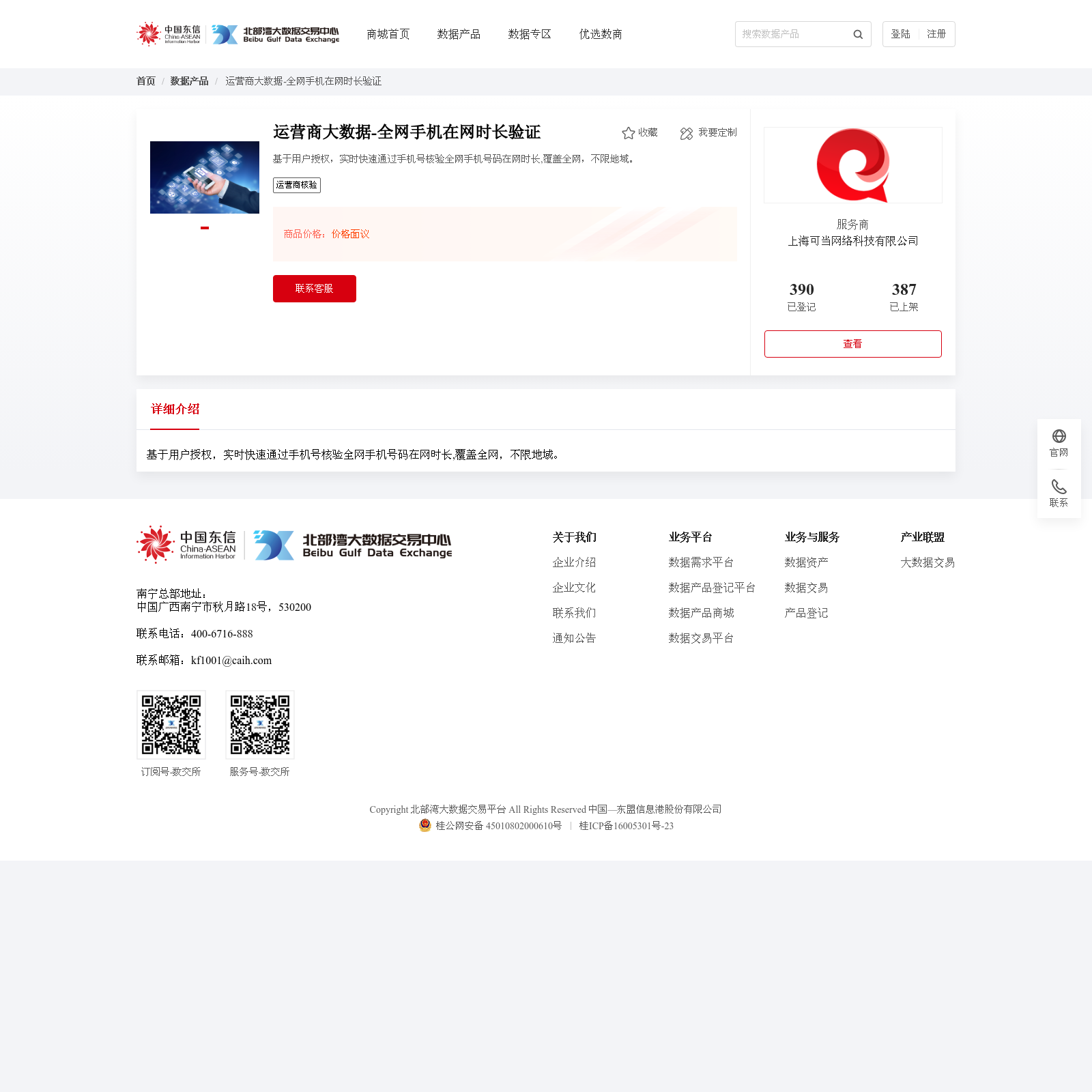 上海可当网络科技有限公司 本次上架的数据产品 运营商大数据-全网手机在网时长验证, 基于用户授权,实时快速通过手机号核验全网手机号码在网时长,覆盖全网,不限地域。
