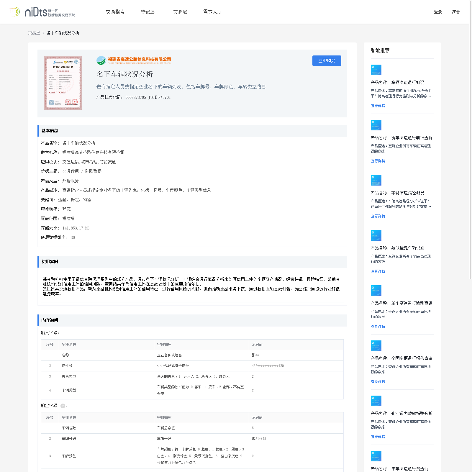 福建省高速公路信息科技有限公司 本次上架的数据产品 名下车辆状况分析, 查询指定人员或指定企业名下的车辆列表,包括车牌号、车牌颜色、车辆类型信息