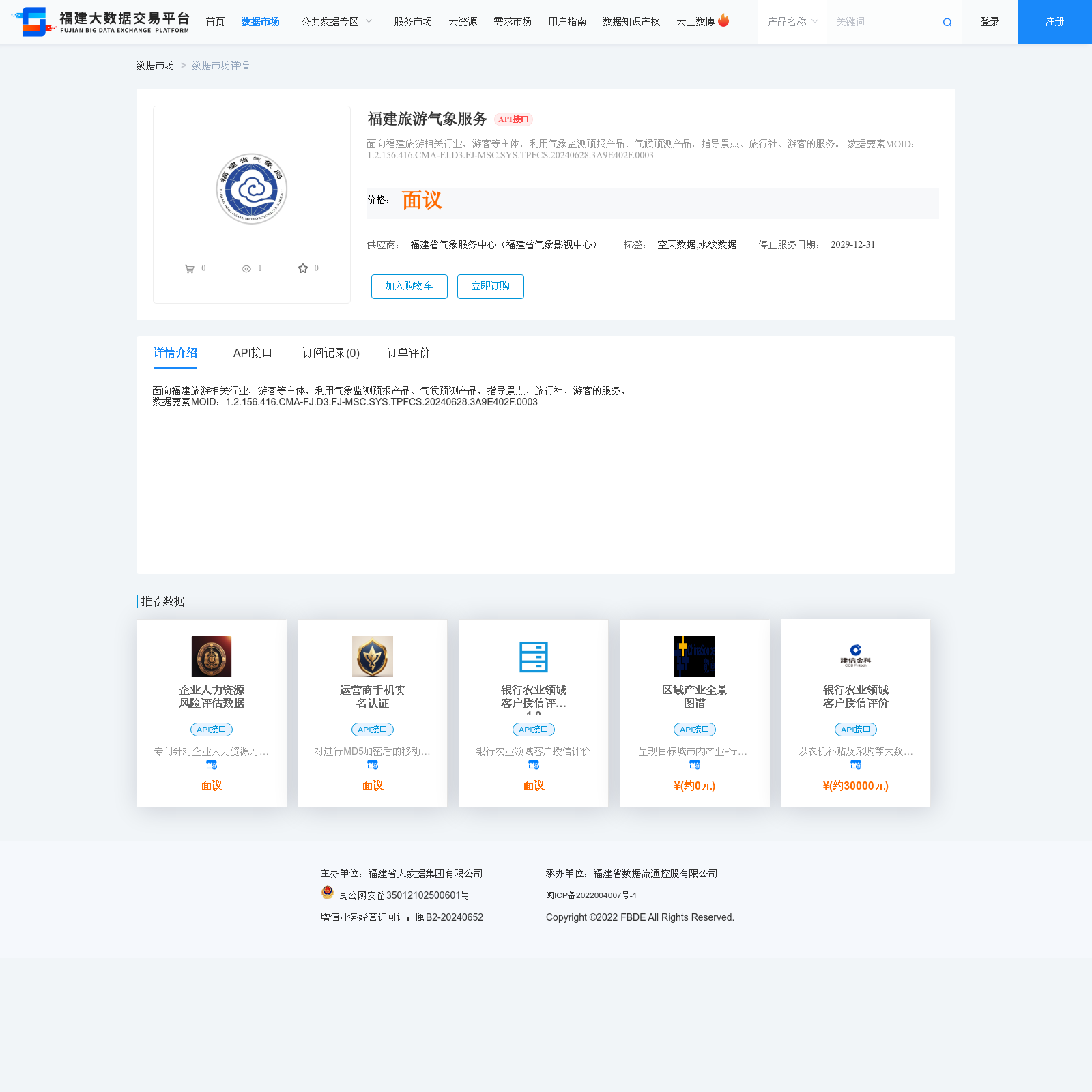 关于 福建省气象服务中心(福建省气象影视中心) , 福建省气象服务中心(福建省气象影视中心)是一家专注于气象服务的机构,其主要业务涵盖公众和行业专项气象服务、气象网络信息服务、气象监测和应用咨询等多个领域。此外,中心还致力于电视气象节目的制作、影视产品摄影及广告开发,并提供全省专业气象及电视气象业务技术指导。该中心的数据集产品种类繁多,包括雷电监测、气象预报、气象影视宣传、矿区气象安全、重大工程气象参数、地面要素融合实况分析、降水影响城市路况预报、多星融合精细化海温、旅游景区气象安全、交通安全气象服务等多项数据产品,这些数据产品均在福建大数据交易所完成挂牌,体现了中心在气象数据服务领域的广泛布局和深厚实力。