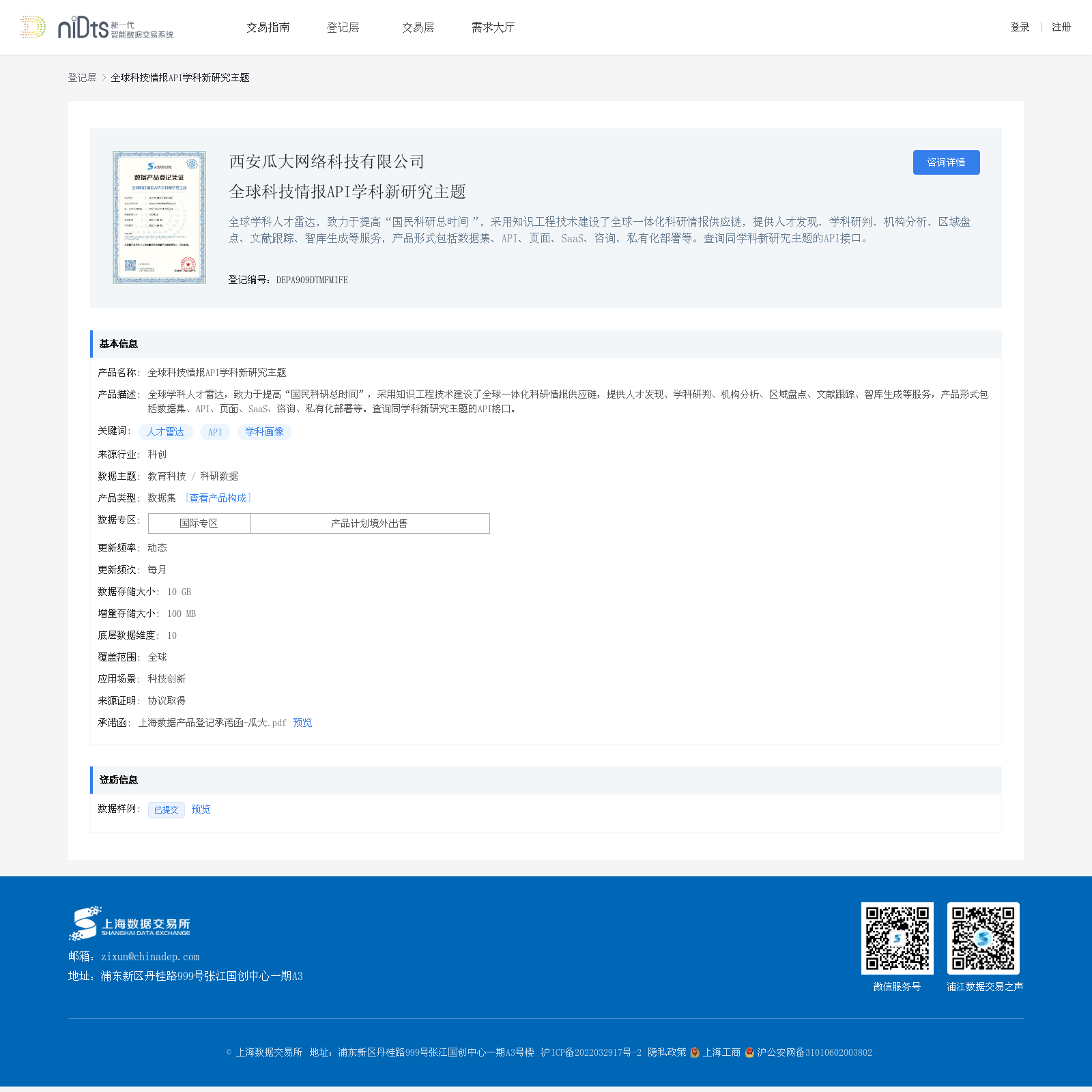 西安瓜大网络科技有限公司 本次上架的数据产品 全球科技情报API学科新研究主题, 全球学科人才雷达,致力于提高“国民科研总时间”,采用知识工程技术建设了全球一体化科研情报供应链,提供人才发现、学科研判、机构分析、区域盘点、文献跟踪、智库生成等服务,产品形式包括数据集、API、页面、SaaS、咨询、私有化部署等。查询同学科新研究主题的API接口。