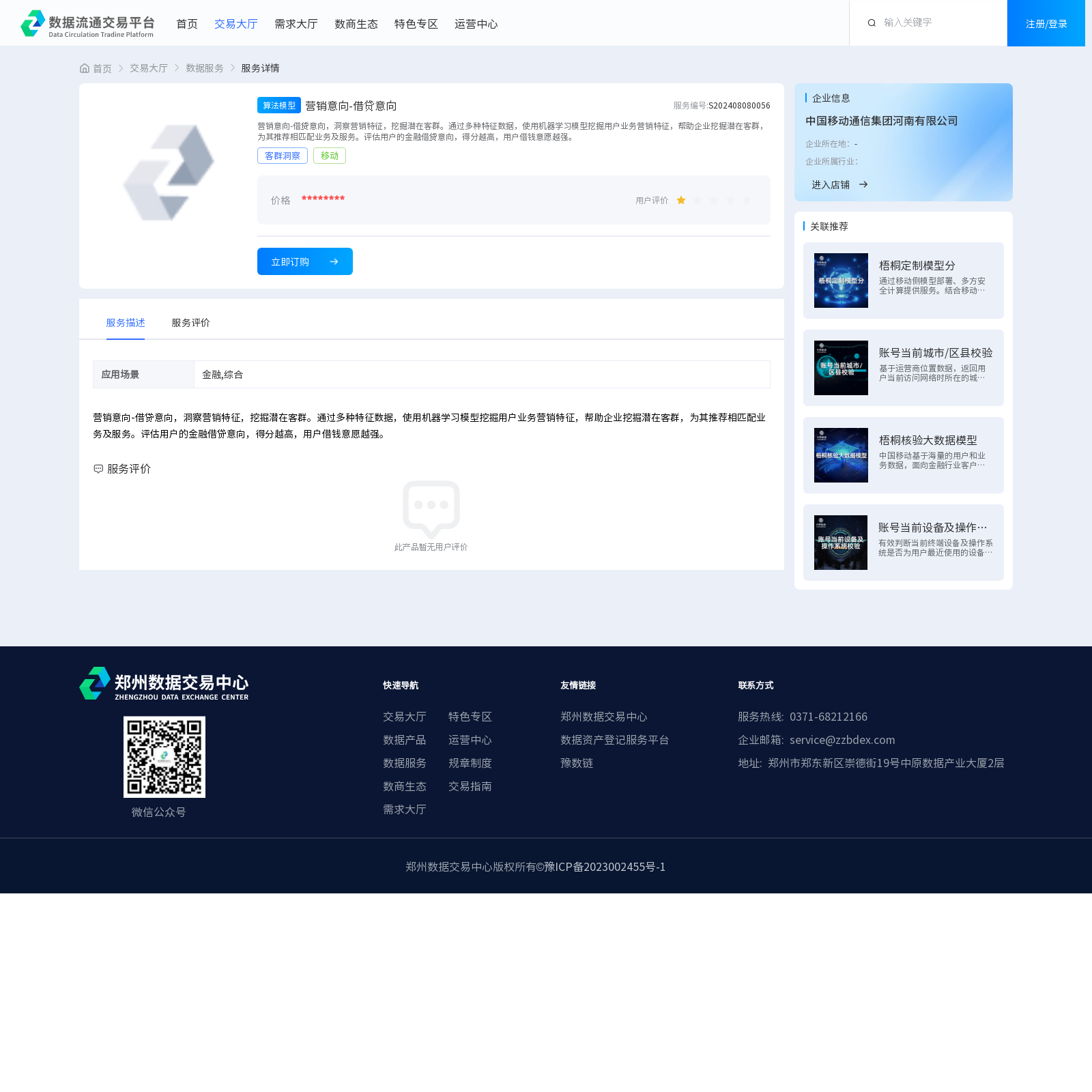 中国移动通信集团河南有限公司 本次上架的数据产品 营销意向-借贷意向, 营销意向-借贷意向,洞察营销特征,挖掘潜在客群。通过多种特征数据,使用机器学习模型挖掘用户业务营销特征,帮助企业挖掘潜在客群,为其推荐相匹配业务及服务。评估用户的金融借贷意向,得分越高,用户借钱意愿越强。