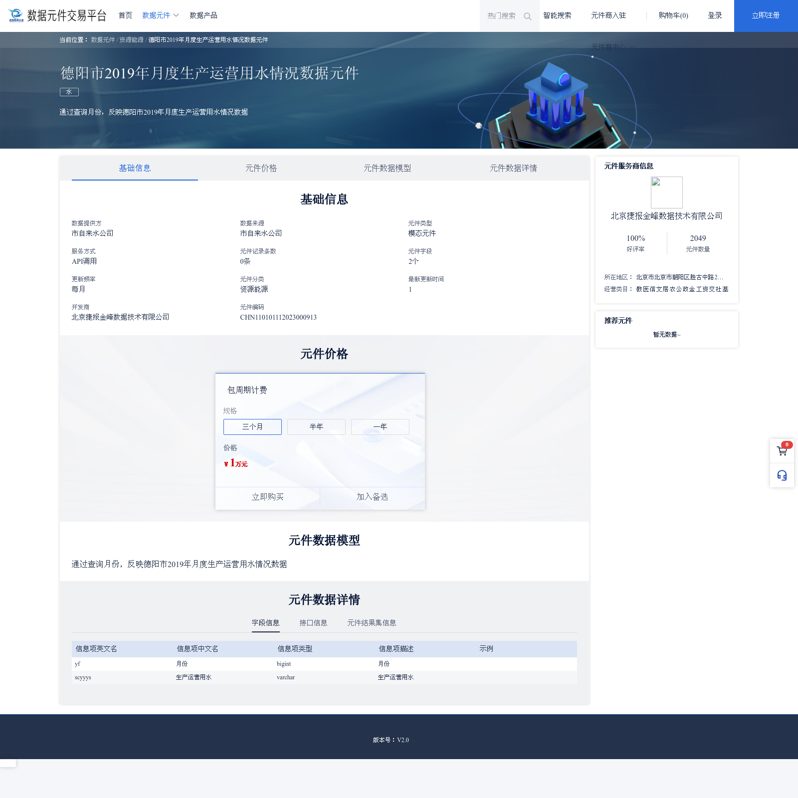 北京捷报金峰数据技术有限公司 本次上架的数据产品 德阳市2019年月度生产运营用水情况数据元件, 通过查询月份,反映德阳市2019年月度生产运营用水情况数据