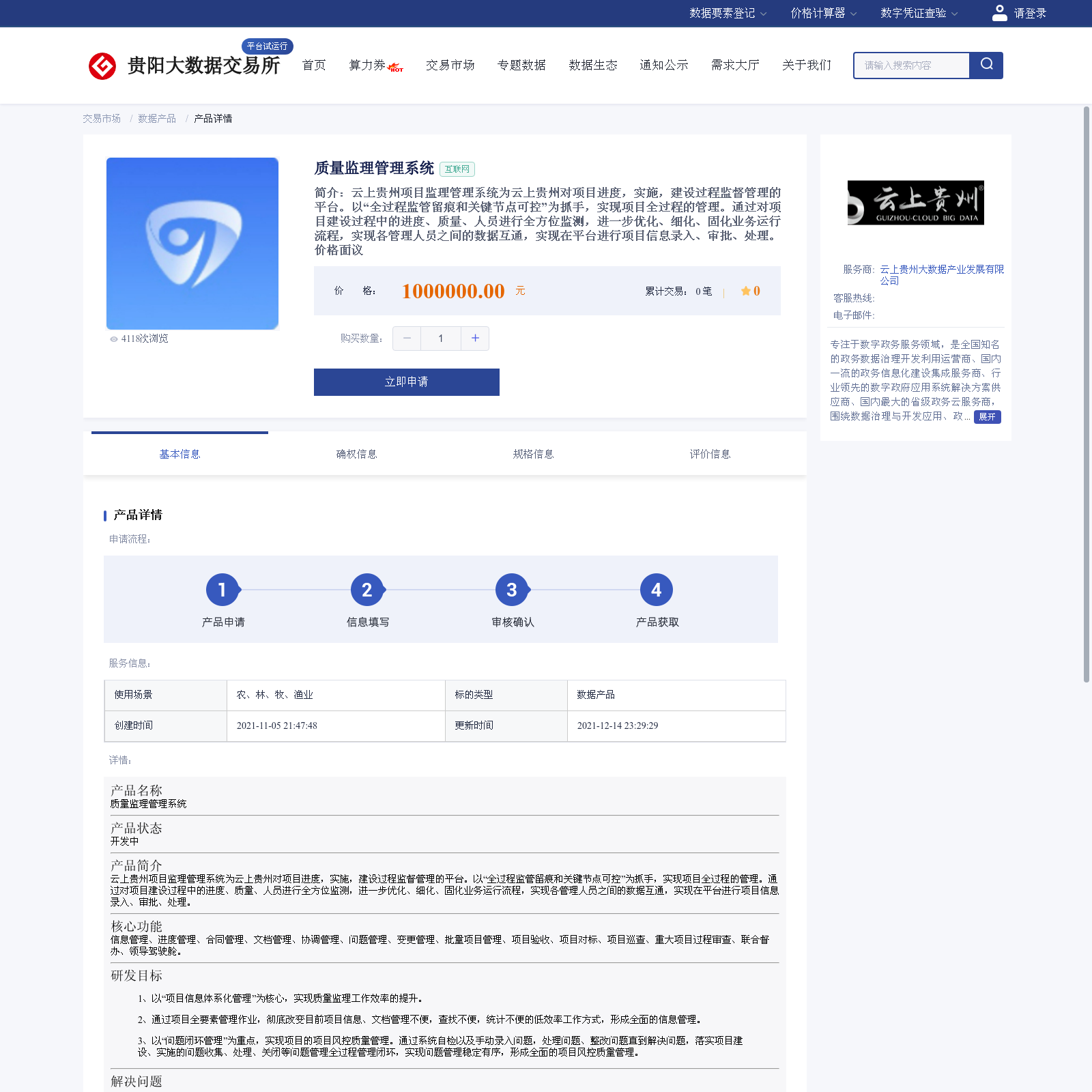 云上贵州大数据产业发展有限公司 本次上架的数据产品 质量监理管理系统, 云上贵州项目监理管理系统为云上贵州对项目进度,实施,建设过程监督管理的平台。以“全过程监管留痕和关键节点可控”为抓手,实现项目全过程的管理。通过对项目建设过程中的进度、质量、人员进行全方位监测,进一步优化、细化、固化业务运行流程,实现各管理人员之间的数据互通,实现在平台进行项目信息录入、审批、处理。价格面议