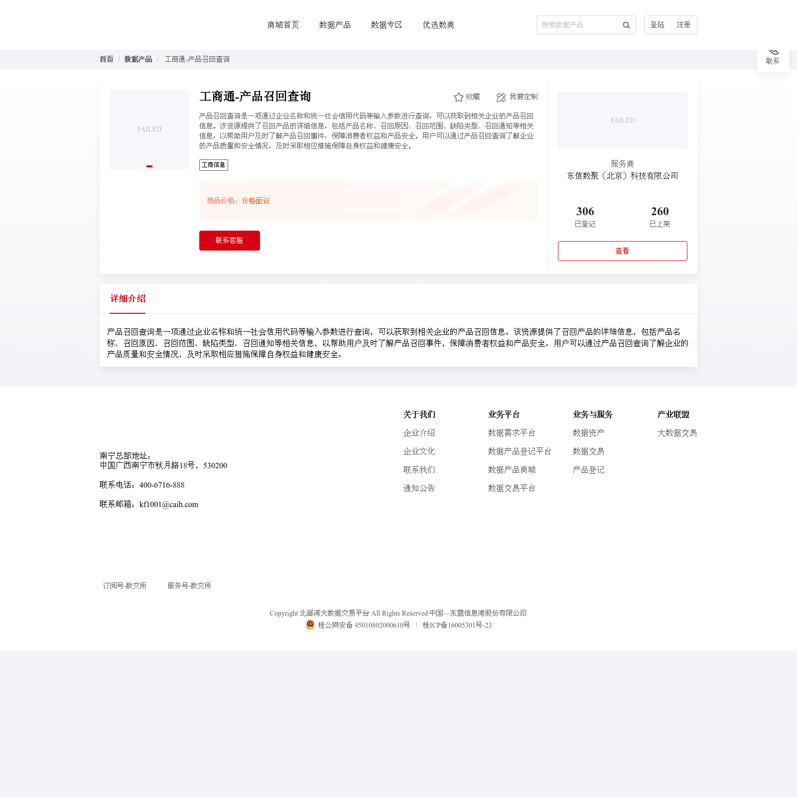 东信数聚(北京)科技有限公司 本次上架的数据产品 工商通-产品召回查询, 产品召回查询是一项通过企业名称和统一社会信用代码等输入参数进行查询,可以获取到相关企业的产品召回信息。该资源提供了召回产品的详细信息,包括产品名称、召回原因、召回范围、缺陷类型、召回通知等相关信息,以帮助用户及时了解产品召回事件,保障消费者权益和产品安全。用户可以通过产品召回查询了解企业的产品质量和安全情况,及时采取相应措施保障自身权益和健康安全。