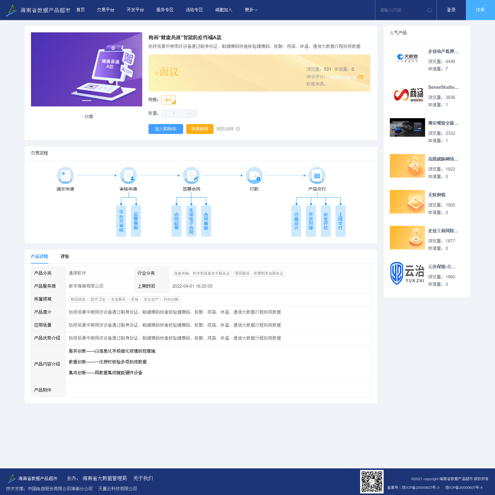 数字海南有限公司 本次上架的数据产品 海南“健康易通”智能防疫终端A款, 防疫场景中使用该设备通过刷身份证、刷健康码快速核验健康码、核酸、疫苗、体温、通信大数据行程防疫数据
