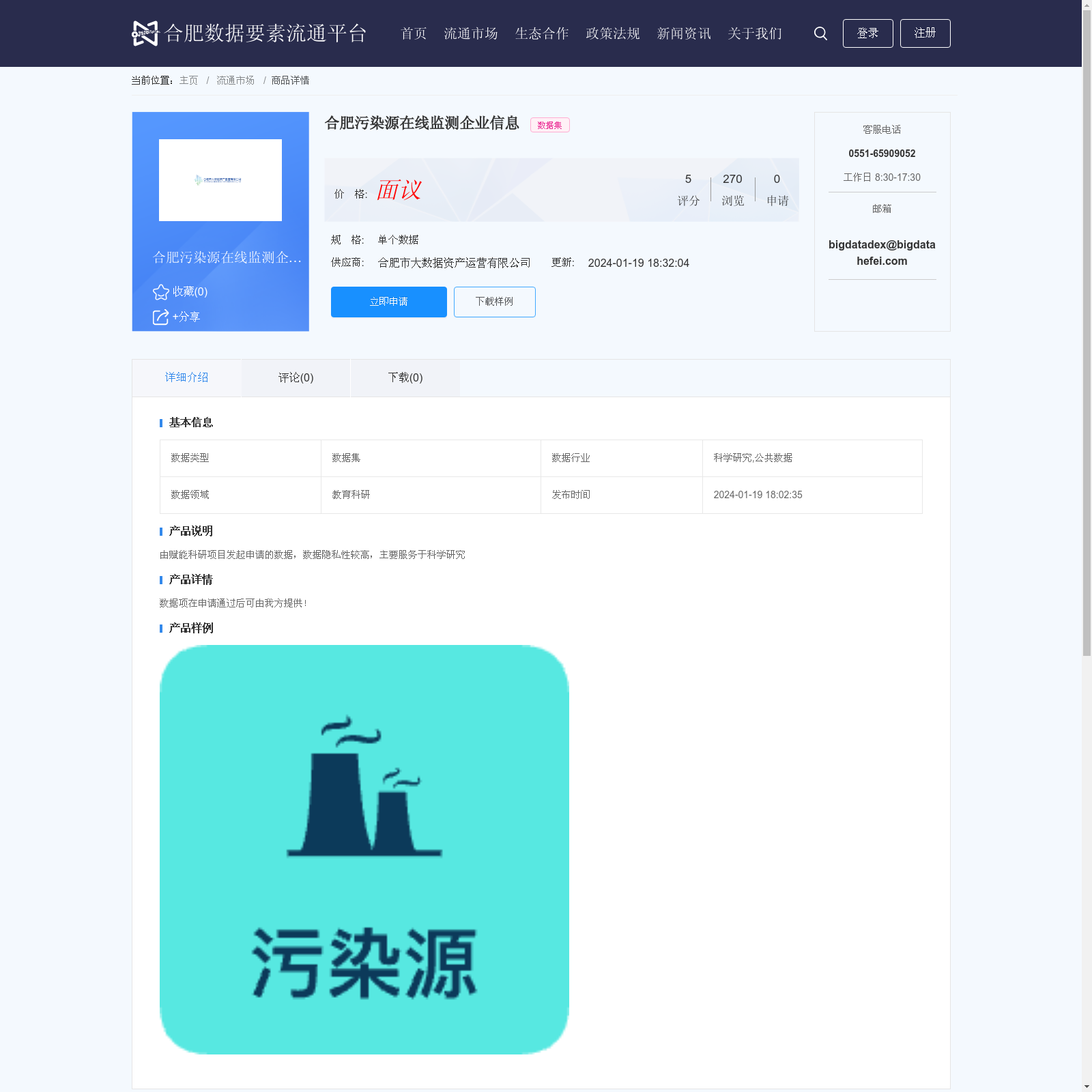 合肥市大数据资产运营有限公司 本次上架的数据产品 合肥污染源在线监测企业信息, 由赋能科研项目发起申请的数据,数据隐私性较高,主要服务于科学研究