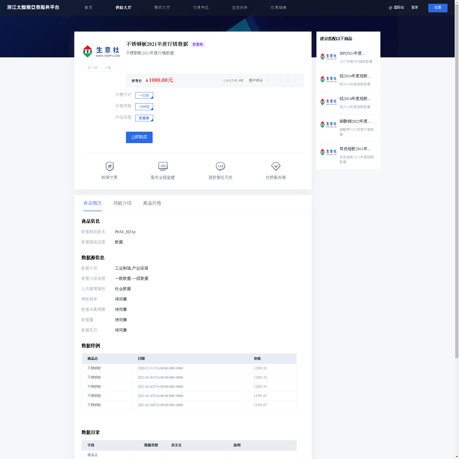 上海生意社信息服务有限公司 本次上架的数据产品 不锈钢板2021年度行情数据, 不锈钢板2021年度行情数据