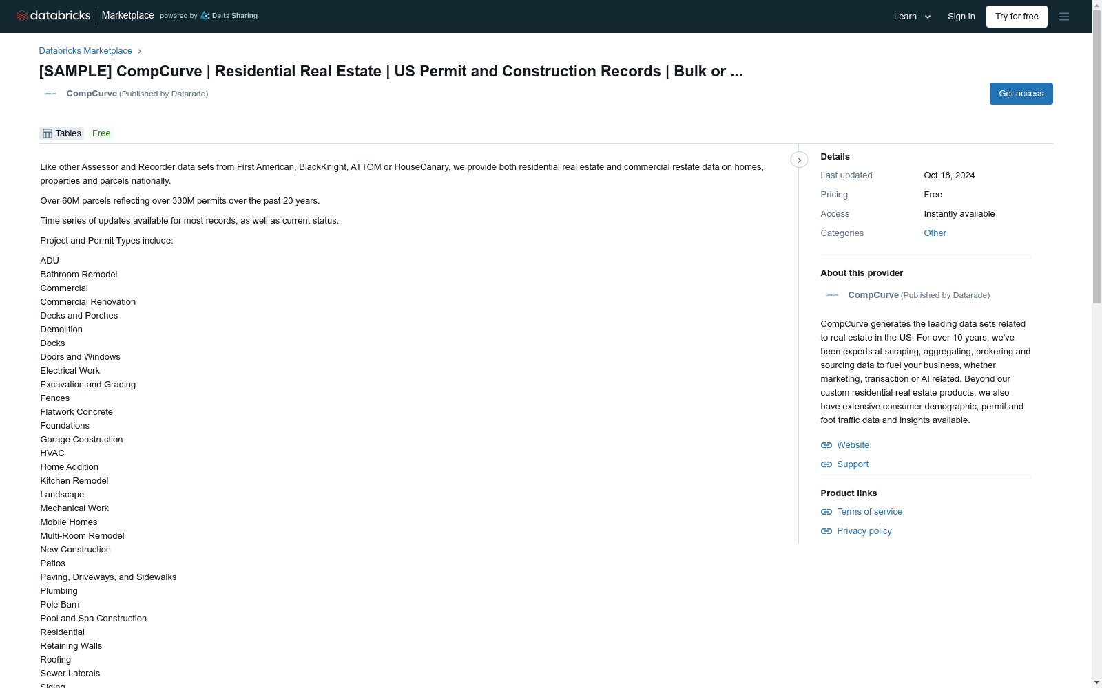 CompCurve 本次发布的数据集 [SAMPLE] CompCurve | Residential Real Estate | US Permit and Construction Records | Bulk or ..., 该数据集提供美国住宅和商业房地产的许可和建设记录,涵盖超过6000万个地块和过去20年内的3.3亿份许可。数据包括多种项目和许可类型,如新增建设、厨房改造、电气工程等,并提供每周、每季度、每年或一次性购买选项。