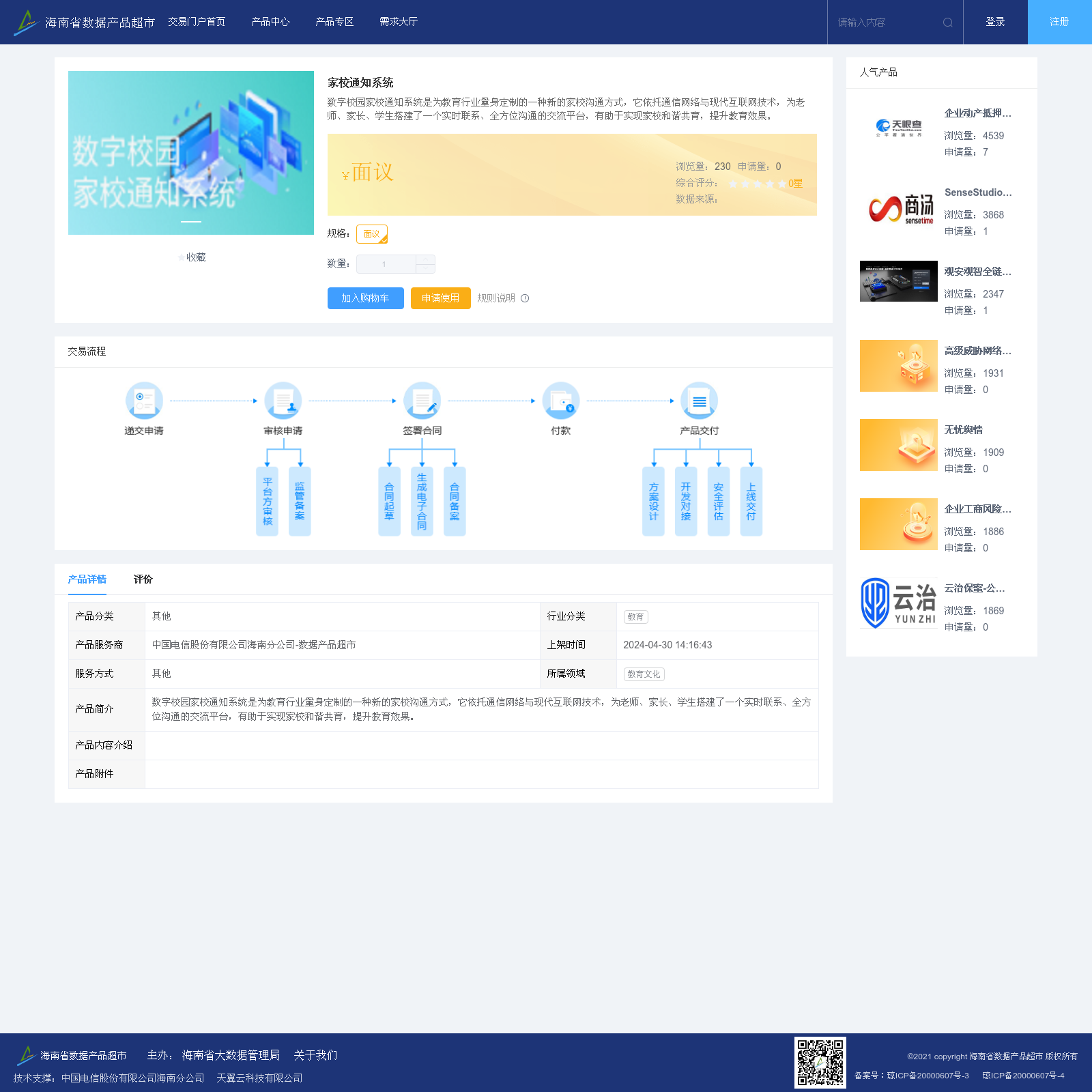 中国电信股份有限公司海南分公司-数据产品超市 本次上架的数据产品 家校通知系统, 数字校园家校通知系统是为教育行业量身定制的一种新的家校沟通方式,它依托通信网络与现代互联网技术,为老师、家长、学生搭建了一个实时联系、全方位沟通的交流平台,有助于实现家校和谐共育,提升教育效果。