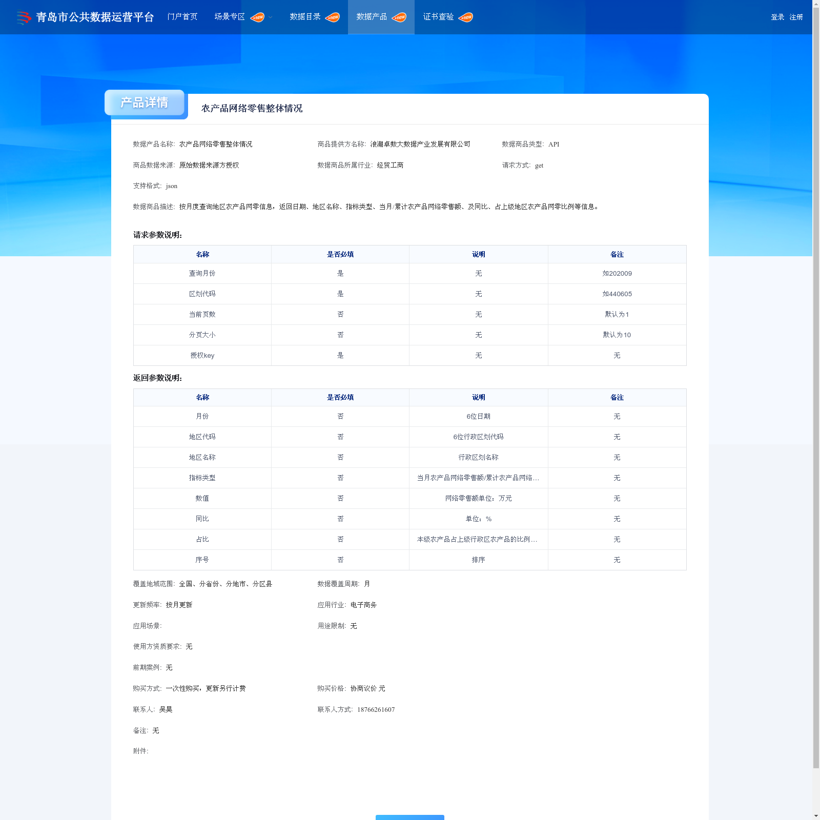 浪潮卓数大数据产业发展有限公司 本次上架的数据产品 农产品网络零售整体情况, 按月度查询地区农产品网零信息,返回日期、地区名称、指标类型、当月/累计农产品网络零售额、及同比、占上级地区农产品网零比例等信息。