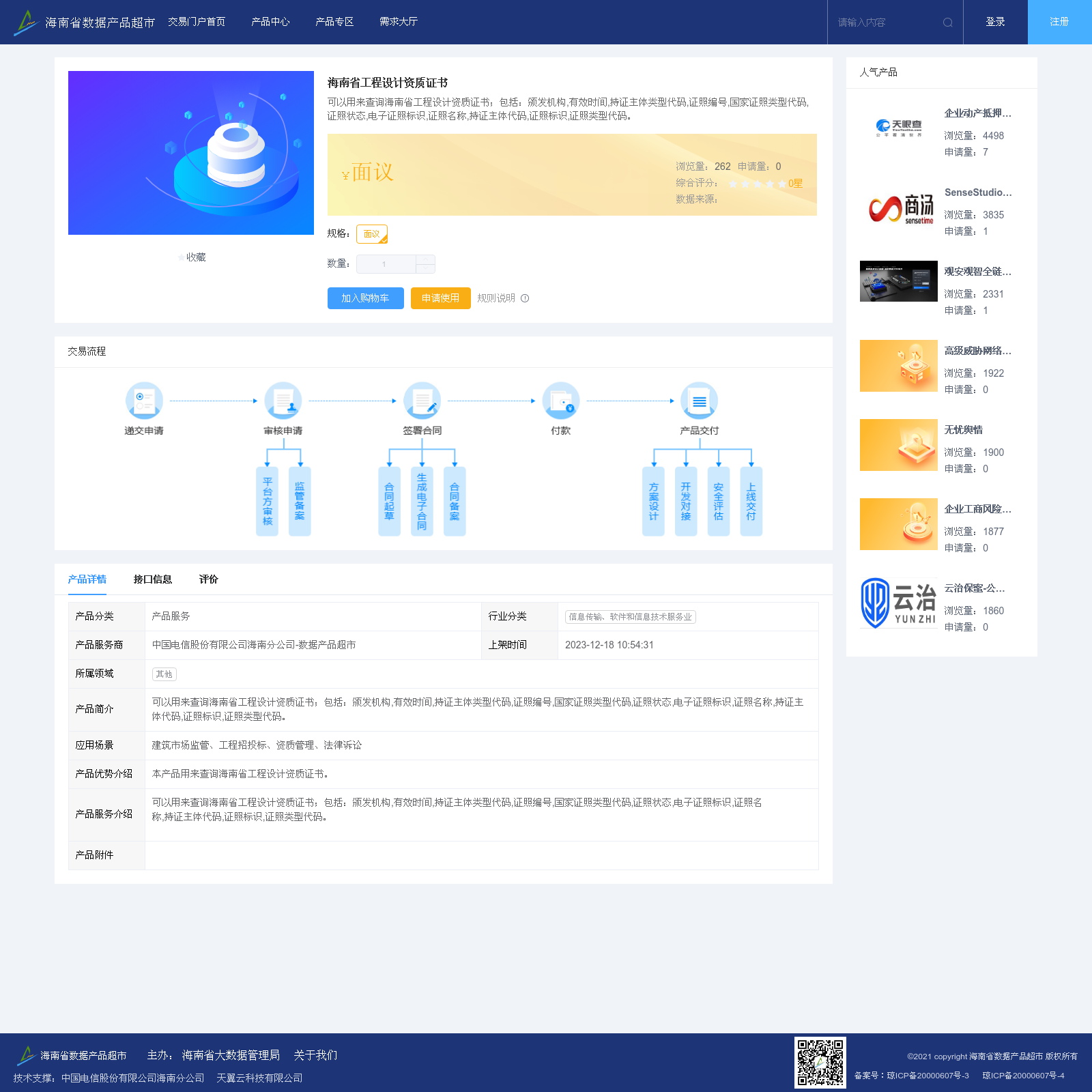中国电信股份有限公司海南分公司-数据产品超市 本次上架的数据产品 海南省工程设计资质证书, 可以用来查询海南省工程设计资质证书;包括:颁发机构,有效时间,持证主体类型代码,证照编号,国家证照类型代码,证照状态,电子证照标识,证照名称,持证主体代码,证照标识,证照类型代码。
